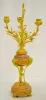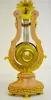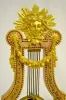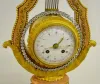 3 Piece Marti Lyre Calendar Clock Set With bell strike movement, No. 127 and a porcelain dial with odiac symbols, the names of each month at each hour, also the day of the month numbers, ornate hands, day of the month and alarm hand. The pink marble case has gilt bronze decoration and a circular pendulum with paste brilliants. The side pieces have 3 candle cups among flowering plants, rams heads and hooves. (1 cup on one candelabra needs re-gilted; the same candelabra has one mismatched rosette.) Clock - 20 1/2" Tall; Side Pieces - 22 1/2" Tall