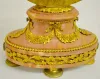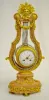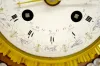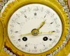 With bell strike movement, No. 127 and a porcelain dial with odiac symbols, the names of each month at each hour, also the day of the month numbers, ornate hands, day of the month and alarm hand. The pink marble case has gilt bronze decoration and a circular pendulum with paste brilliants. The side pieces have 3 candle cups among flowering plants, rams heads and hooves. (1 cup on one candelabra needs re-gilted; the same candelabra has one mismatched rosette.) Clock - 20 1/2" Tall; Side Pieces - 22 1/2" Tall
