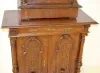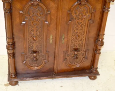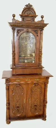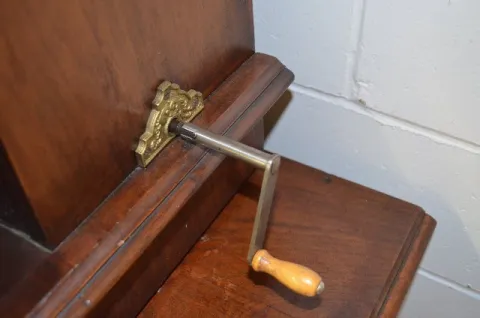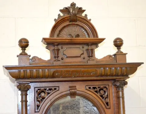 This player, Style 104, double comb with 118 teeth (all teeth are in good condition.), is coin operated with 2 coin slots and is in a carved case with "Polyphone" above the door and a drawer under it. The music player sits on a carved cabinet with 3 shelves and 1 drawer. There are 11 - 19 3/8" disks with the player. Even though there are 2 coin slots it can be manually operated. It sounds wonderful when playing! 87" Tall