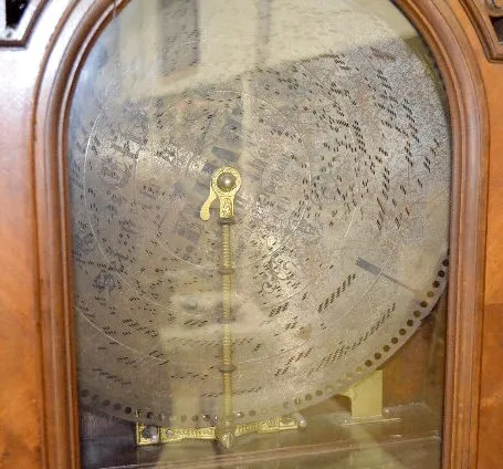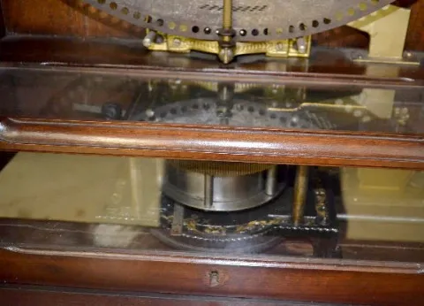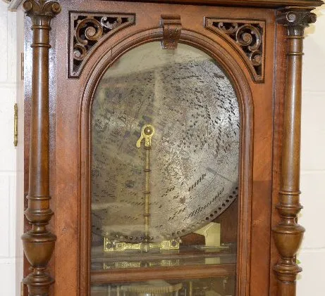 Polyphone Coin Operated Music Disk Player w/Disks This player, Style 104, double comb with 118 teeth (all teeth are in good condition.), is coin operated with 2 coin slots and is in a carved case with "Polyphone" above the door and a drawer under it. The music player sits on a carved cabinet with 3 shelves and 1 drawer. There are 11 - 19 3/8" disks with the player. Even though there are 2 coin slots it can be manually operated. It sounds wonderful when playing! 87" Tall