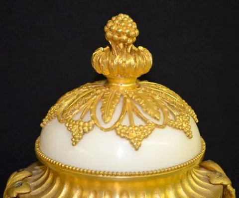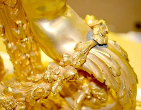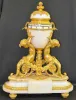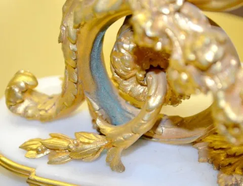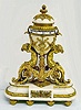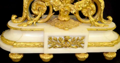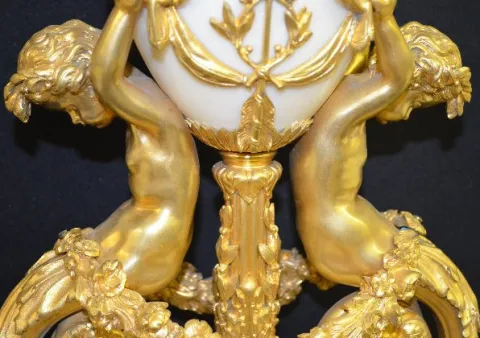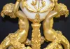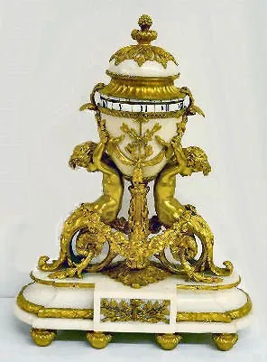 The dial has Roman and Arabic Numbers on it. The tip of an arrow is the time indicator. The clock case is supported by half figured putti. Their lower half is in the form of acanthus leaves. A floral garland is draped around the center. The clock is running at this time. (The "VII" is damaged; green oxidation on the inside curled tail of the left side nymph; minor green oxidation under garland on right side nymph.) 20 3/4" Tall x 16" Wide