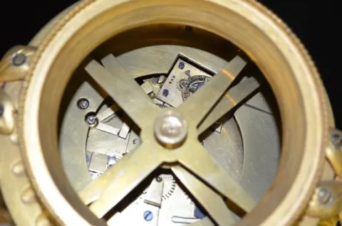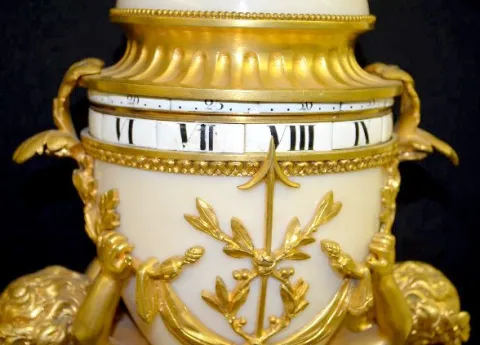 French Annular Dial Bronze & Marble Clock w/Putti The dial has Roman and Arabic Numbers on it. The tip of an arrow is the time indicator. The clock case is supported by half figured putti. Their lower half is in the form of acanthus leaves. A floral garland is draped around the center. The clock is running at this time. (The "VII" is damaged; green oxidation on the inside curled tail of the left side nymph; minor green oxidation under garland on right side nymph.) 20 3/4" Tall x 16" Wide