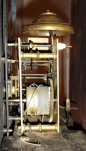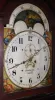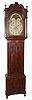 Mahogany veneered and inlayed Gothic style case in old finish with some cracking of the veneer on the base from the basic construction techniques telegraphing through the veneer. The hood door has had some repairs in the past. Dial retains original paint. Moon dial has some loss, but not bad for its age. Ht 90".