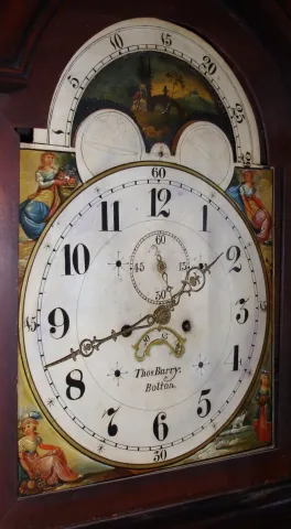 English, "Thomas Barry, Bolton", 8 day, time and strike, tall clock in a mahogany case, c1820. Mahogany veneered and inlayed Gothic style case in old finish with some cracking of the veneer on the base from the basic construction techniques telegraphing through the veneer. The hood door has had some repairs in the past. Dial retains original paint. Moon dial has some loss, but not bad for its age. Ht 90".