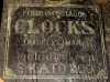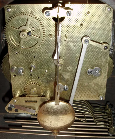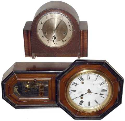 The German chiming clock has an ornate dial and good quality W200 pendulum movement, 8 1/2" high. The Japanese regulator, made to imitate Connecticut clocks of the same period, has a two-tone case and fancy pendulum, 22" high. Note that round glass and its bezel are detached. Both wood cases have their original dry finishes. Neither tested; sold as is.
