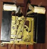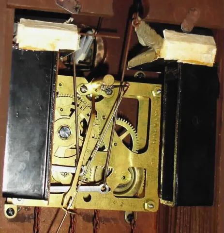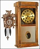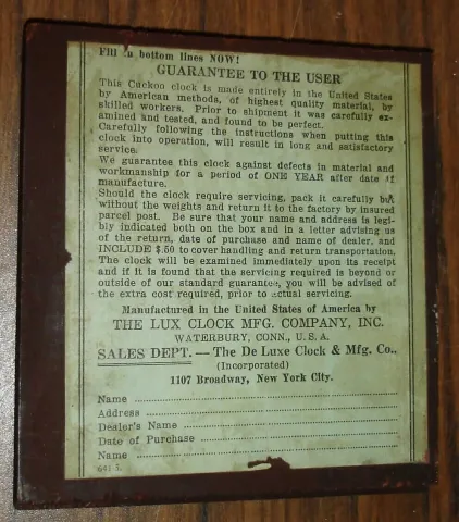 Clocks- 2 (Two) wood wall clocks: German 8 day, time and strike box regulator; Lux Waterbury Conn. 30 hour cuckoo; early 20th century The regulator's case has been stripped and is ready for stain and finish, and it now has a mirror tablet with center viewing hole. Its brass dial, with bold black numbers, is showing some wear, and the movement will need service. Ht 27". The small cuckoo retains its complete label asserting that this was entirely American made, and the case can be cleaned and polished. Its movement and bellows also will need attention. Ht 11".