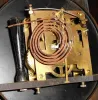 The regulator's case has been stripped and is ready for stain and finish, and it now has a mirror tablet with center viewing hole. Its brass dial, with bold black numbers, is showing some wear, and the movement will need service. Ht 27". The small cuckoo retains its complete label asserting that this was entirely American made, and the case can be cleaned and polished. Its movement and bellows also will need attention. Ht 11".