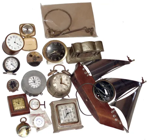 The glass ball paperweight clock needs to be reassembled and restored. The Newman watchman's clock has a spare movement. There is a French drum clock. Most interesting may be the brass bracket and holder probably for a Waltham gaslight clock. All sold as is.