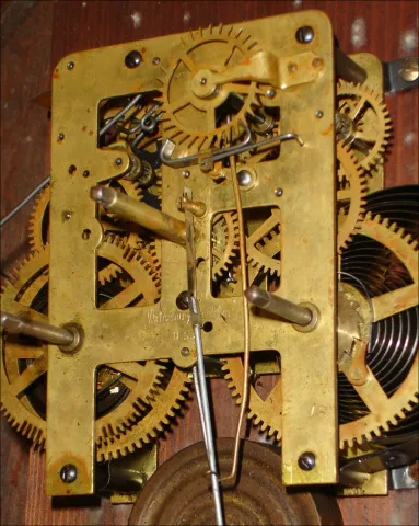 Barrel Clock, probably by C.A. Warner and Co., with Waterbury 8 day, time and strike movement, c1925 This is a large authentic dark wood barrel fit with a dial showing two monks enjoying a brew. We have seen one other brought to a local repairer, and we note one for sale on the Internet with the Warner and Co. attribution and date. Our example is missing its stand and pendulum, and has no markings beyond the signed Waterbury open spring movement which will need service. 17" diameter