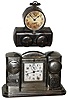 These are old and interesting American novelty alarm clocks with little lights for night viewing. The larger Flashlight model also has a savings bank built in. Both cases are in decent as-found condition, the push-button cords are absent, and the balance-wheel movements have not been tested. See Ly's American Clocks Vol.2, p.94. Ht 8 1/2"