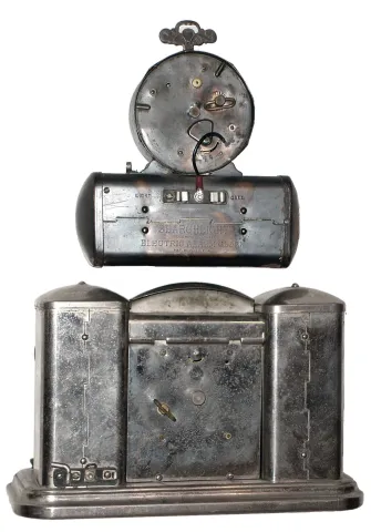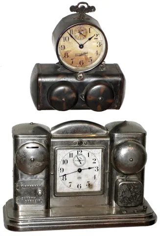 Clocks- 2 (Two) Darche Mfg. Co., Chicago, IL 8 day "Flashlight" and 30 hour "Searchlight" nickel plate alarm novelty clocks with battery-powered lights, c1910 These are old and interesting American novelty alarm clocks with little lights for night viewing. The larger Flashlight model also has a savings bank built in. Both cases are in decent as-found condition, the push-button cords are absent, and the balance-wheel movements have not been tested. See Ly's American Clocks Vol.2, p.94. Ht 8 1/2"