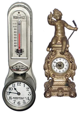 The novelty clock is complete and retains its nice old gold plating and good porcelain dial, but the top of the trident has been bent and must be straightened with care. The rear-wind movement ticks, ht 8". The Minneapolis, designed to automatically control a home heating system, is in good original condition, with no losses or damage, but a mainspring is broken and we hear no ticking, ht 9 1/2"