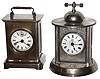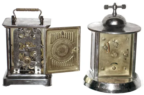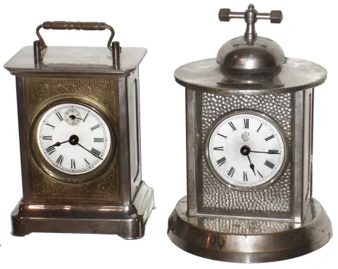 Clocks- 2 (Two) Waterbury Clock Co. nickel 30 hour alarm clocks: "Guide" with strike; "Magnet" with top bell, c1890