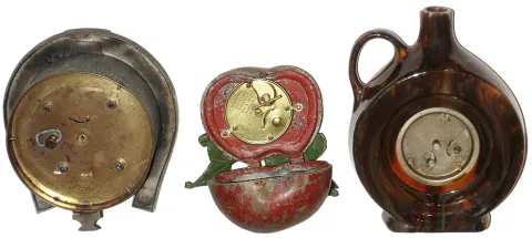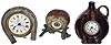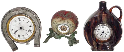 Clocks- 3 (Three) Waterbury Clock Co. 30 hour rear wind novelty time pieces: nickel "Derby", Lux "Jug" with Waterbury insert, metal novelty "Apple", c1906