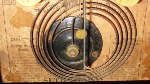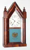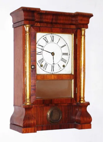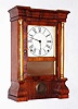 Clocks- 2 (Two) Seth Thomas Clock Co., 8 day, time and strike, miniature column and cornice mantel clock, c1870.; Connecticut rosewood 30 hour time and strike steeple clock, c1880