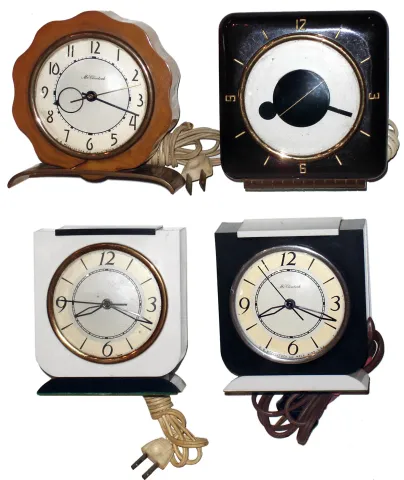 Clocks- 4 (Four) Deco electric desk models by O.B. McClintock, Minneapolis, Bakelite cases, c1935 The maker of those big 4-side outdoor building clocks also made dramatic and quality plug-ins. These four are in very good condition, but none tested and are sold as is. All approximately 5" high