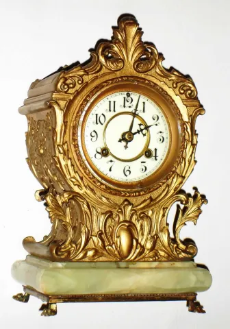 Waterbury Clock Co., Waterbury, Conn., cast metal and onyx 8 day, time and strike mantel clock, c1900