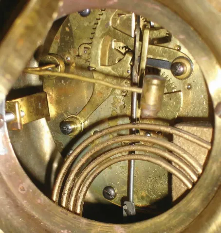 There now is older gold paint on this ornate model not shown in Ly. The porcelain dial is fine, the beveled glass has a few edge chips, and the light ...