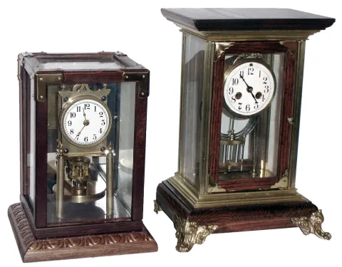 Clocks- 2 (Two) brass, glass and wood crystal regulators: French 8 day, time and strike; German 400-day; 20th century.