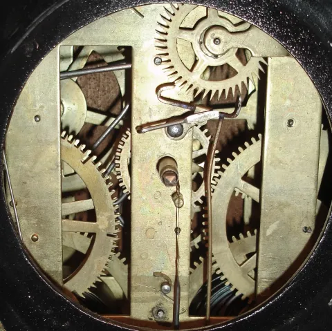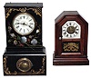 Clocks- 2 (Two) Connecticut shelf models: Atkins rosewood time/alarm 30 hour cottage; unsigned iron-front time and strike 8 day, c1850