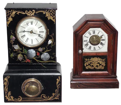 Clocks- 2 (Two) Connecticut shelf models: Atkins rosewood time/alarm 30 hour cottage; unsigned iron-front time and strike 8 day, c1850 The Atkins octagon-top case is nicely refinished, the paper dial is new, 10 1/4" high. The iron front's gold flourishes have been repainted, the large mother of pearl insets are fine, and the white painted metal dial has some infill, 14" high. Neither tested, sold as is.