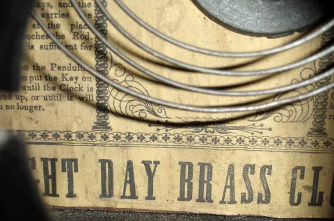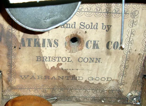 The Atkins octagon-top case is nicely refinished, the paper dial is new, 10 1/4" high. The iron front's gold flourishes have been repainted, the large mother of pearl insets are fine, and the white painted metal dial has some infill, 14" high. Neither tested, sold as is.
