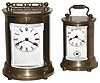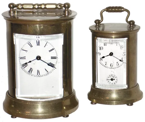 Clocks- 2 (Two) Waterbury Clock Co. round gold plated brass and glass carriage clocks, "Satellite" and "Skip", c1909