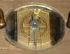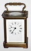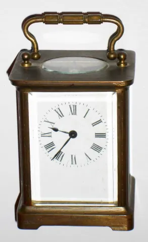 French 8 day brass and glass carriage time piece, c1910 This case is intact and has an old dark patina. Except for a small corner chip in the back door, all the beveled glass is good. The white porcelain dial has no flaws and just needs to be cleaned. The original cylinder balance platform looks okay, but a broken mainspring needs to be addressed. An "A.C.C." stamp can be seen on the back of the works. Ht to handle top 5 1/2"