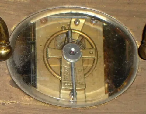 This case is intact and has an old dark patina. Except for a small corner chip in the back door, all the beveled glass is good. The white porcelain dial has no flaws and just needs to be cleaned. The original cylinder balance platform looks okay, but a broken mainspring needs to be addressed. An "A.C.C." stamp can be seen on the back of the works. Ht to handle top 5 1/2"