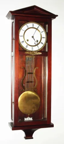 Korean 30 day time and strike mahogany reproduction of Austrian wall clock, c1980 The well made hardwood case has a nice finish with some small scratches, the white enamel dial and beat scale need light cleaning, the large gridiron pendulum has some lacquer spotting, and the minute hand needs straightening. All the glass is good; the side panels are beveled. The spring-driven movement ticks and strikes. Ht 37"