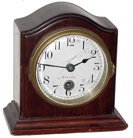Boston Clock Co., by Chelsea, 8 day miniature desk clock, c1919 This is the Babro No. 26 but sold under the Boston name when Chelsea was using that line to compete with lower-priced competitors. The solid mahogany case, convex beveled glass, and porcelain dial are fine. Nickel-plate movement 13833B has a broken balance staff and a winding problem, so service will be needed. Ht 4 1/2"