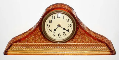 McKee Glass Co., Jenrette, Penn., Daisy and Button pressed glass tambour 30 hour time piece, c1930 A very nice example, the thick amber glass ornate case is flawless and the paper dial is clean. The rear wind movement ticks and stops. Ht 6"
