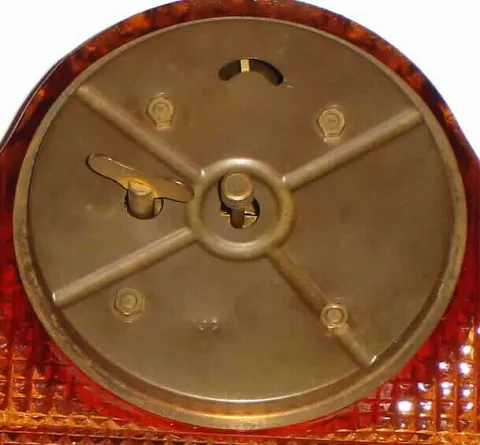 A very nice example, the thick amber glass ornate case is flawless and the paper dial is clean. The rear wind movement ticks and stops. Ht 6"