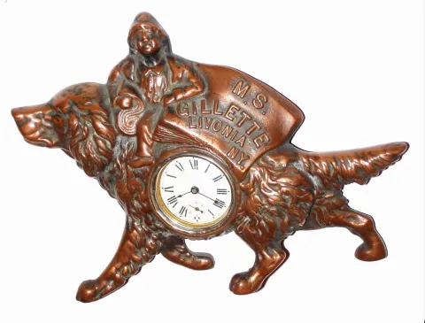Waterbury Clock Co., Waterbury, Conn., M.S. Gillette Livonia, NY" cast metal 30 hour novelty time piece, c1910.