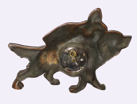 The St.Bernard and rider have a nice old bronze patina, with no damage. The paper dial is near perfect, but the rear wind movement does not tick. Ht...