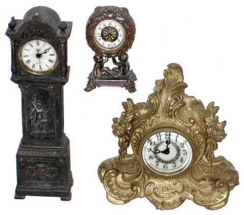 Clocks- 3 (Three) Waterbury Clock Co., Waterbury, Conn., cast metal 30 hour novelty time pieces, c1891