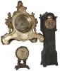 Nicest and fanciest is the "Sheba" with bright gilding, thick beveled glass, floral porcelain dial, and exotic hands, ht 8". The miniature long case i...