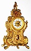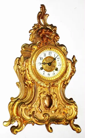 The old gilt patina mostly remains and gleams on this heavy ornate clock not shown in Ly. The porcelain chapter ring and thick beveled glass are prist...