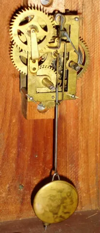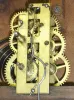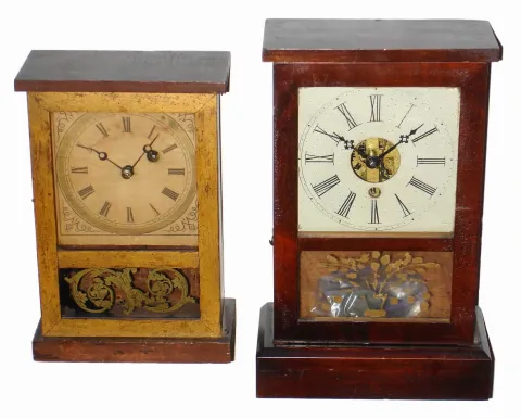 Clocks- 2 (Two) Connecticut small 30 hour wooden cottage time pieces, c1850 There are no maker names on these time-only clocks, but we believe them to be Connecticut. Both have old finishes and glasses, and wooden dials -- one painted, one yellowing paper. The clock on the right has the same mov't as another one in the sale bearing the label of "New England Clock Co". The movements tick but may need cleaning; the larger clock's has its mainspring behind the back plate. Hts 9" and 11 1/2"