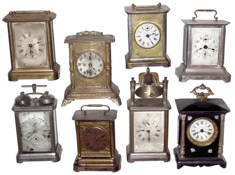 Clocks- 8 (Eight) metal case carriage, various makers, late 19th and early 20th century
