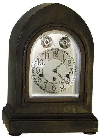 Junghans, Germany mahogany 8 day Westminster chime bracket clock, c1925 The old original finish is lightly crazed and scratched, and can use some polishing but is otherwise in nice condition. The silvered dial has just a bit of discoloration, and the thick beveled glass is fine. The A42 3-train movement has been brightly restored and is running. Ht 15"