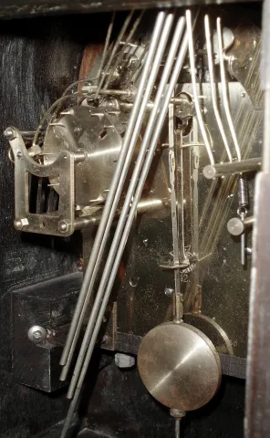 The old original finish is lightly crazed and scratched, and can use some polishing but is otherwise in nice condition. The silvered dial has just a bit of discoloration, and the thick beveled glass is fine. The A42 3-train movement has been brightly restored and is running. Ht 15"