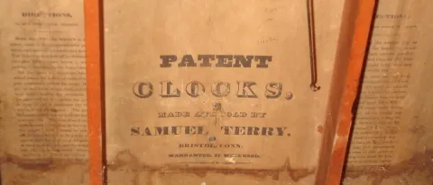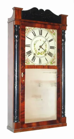 Samuel Terry, Bristol, Conn., 30 hour wood movement half column and splat shelf clock, c1830 Mahogany veneered case in an old and possibly original finish with crotch mahogany veneer used on the door. Original painted dial is very clean. Hands are original. Movement is original. Original weight pulley dust covers. Mirror is a replacement. stenciling is on the columns and splat is a modern restoration. Ht 33"