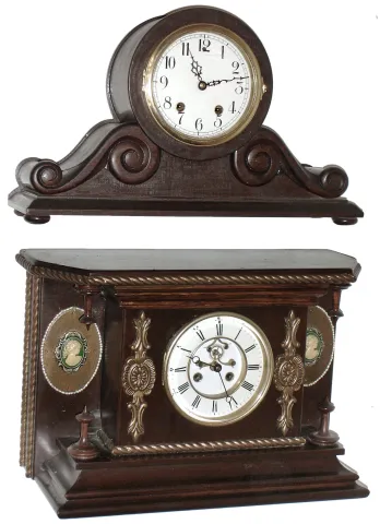 Clocks- 2 (Two) 8 day, time and strike wood case mantel clocks, New Haven "Tambour No 1/2" and French, 20th century