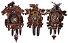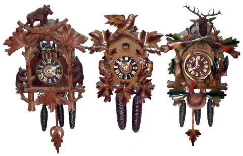 Clocks- 3 (Three) modern carved wood 30 hour cuckoos, two are 3-weight, late 20th century. These are three good examples in a variety of colorful styles -- topped by a bear, antlered deer head, and flying bird. One 3-weight has rotating dancers, the other cuckoo and quail. Except for a missing pendulum, these appear complete but are sold as is. Ht of largest case is 18".