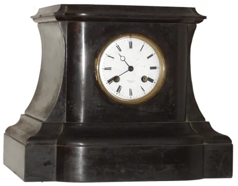 Tiffany and Co., New York, French black marble 8 day, time and strike mantel clock, c1870 This is a deep and heavy stone clock, probably designed for a top statue (but no sign one ever was there). There are only a few very small edge chips, and otherwise the case is intact except for cracked glass in the rear door. The unmarred white enamel dial has the Tiffany name. The round bell-strike movement, unusually stamped A. Brocot and Deletrez, Paris", ticks and strikes but may need service. Pendulum 7802 matches the number on the movement back plate. Depth 8 1/2", ht 10"