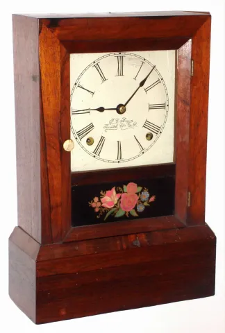 J.C. Brown, Bristol, Conn., mahogany 8 day, time and strike cottage clock, c1850 This clock has been nicely restored with a smoothly refinished case and professionally redone dial. The top clear glass is wavy and bubbly, the lower is correct but may also have been redone. Inside is a good green original label. The movement ticks and strikes. Ht 15"