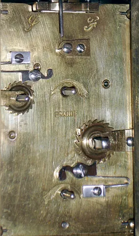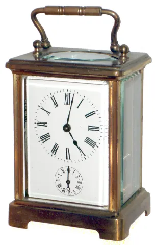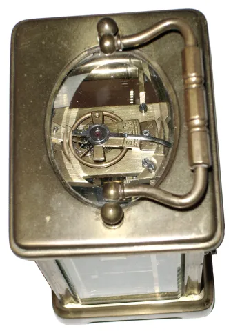 French brass 8 day, time and alarm corniche carriage clock, c1900 The case has an old patina, and the beveled glasses and white porcelain dial all are fine. The original jeweled cylinder platform ticks nicely and the clock has had recent service, but minor adjustments may be needed. The alarm rings on its bell mounted in the base. Ht including handle 6"