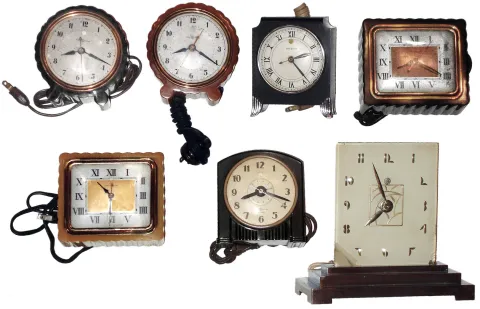 Clocks- 7 (Seven) Deco GE electric desk models in Bakelite, metal and glass cases, c1930