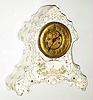 Waterbury Clock Co., Waterbury, Conn., "Parlor No. 18" 8 day, time and strike porcelain mantel clock, c1900 The white china case is intact with just the expected light crazing. There is some tarnish on the brass dial and cast bezel; the beveled glass is fine. On the back are two original paper labels; model number and instructions. The movement ticks, with its jeweled exposed escapement, and strikes but could use cleaning. Ht 12"